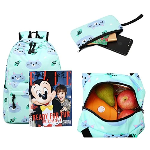 - Cute cat School Backpack 3 in 1: Teens Backpack + Lunch bag + Pencil bag, soft polyester material won’t rip or tear when you put a lot inside, smooth zipper with leather puller which makes it feel nice and slides easily.
