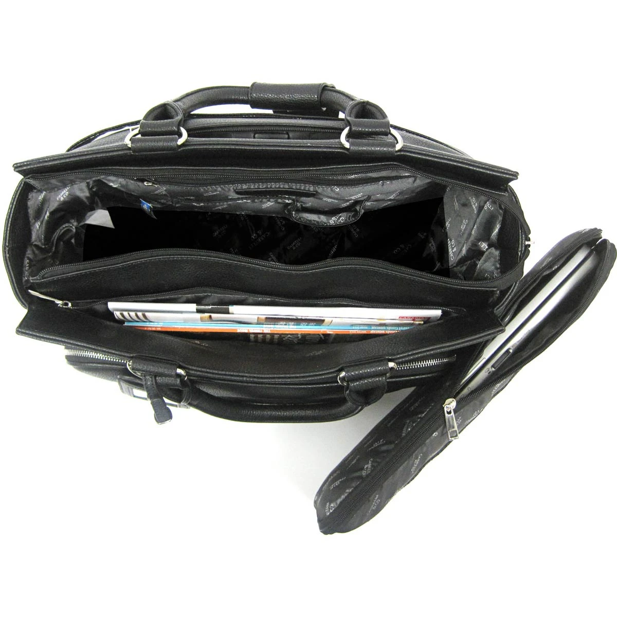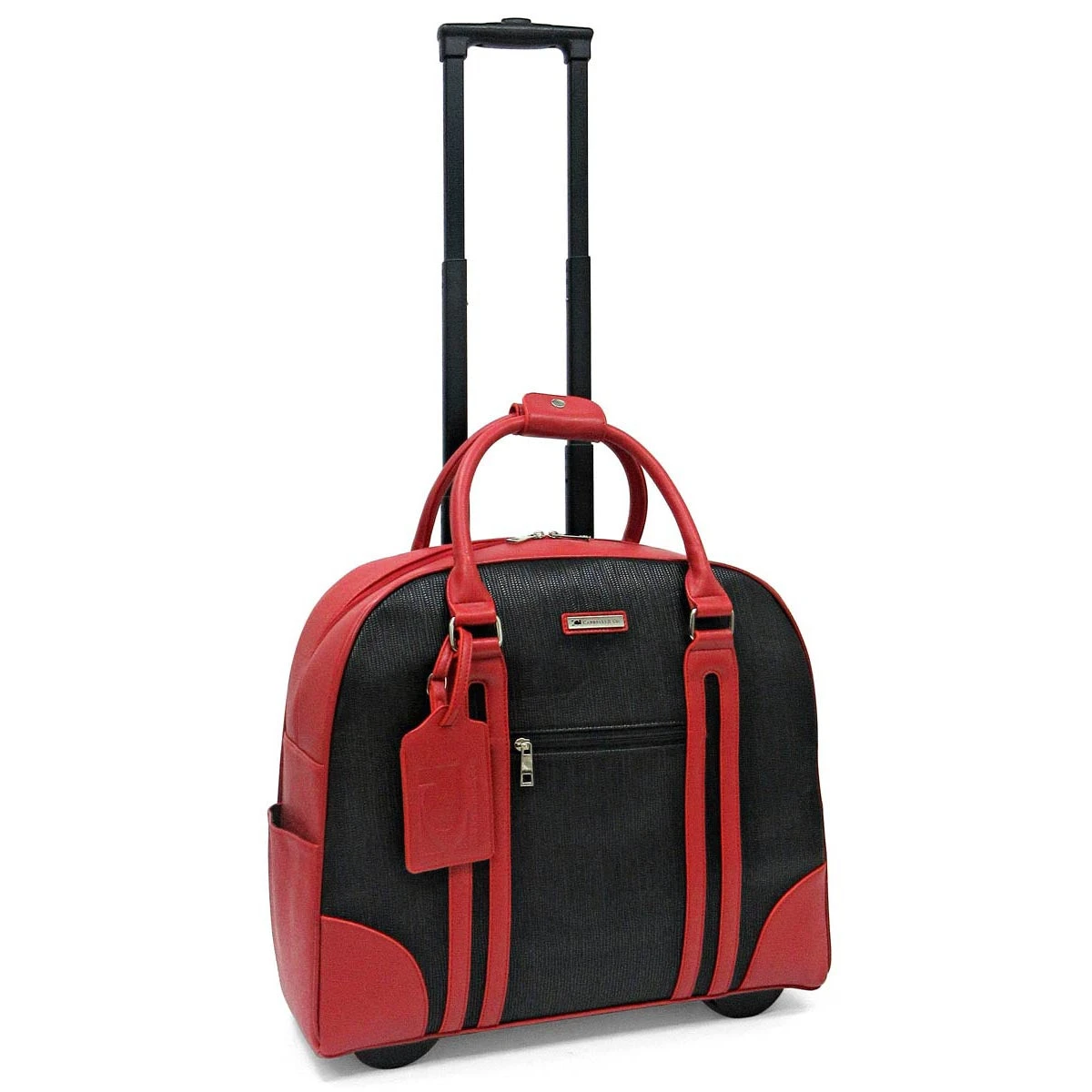 This airplane carry-on size executive rollerbrief, a textured faux leather beauty with front zipper pocket pvc detailing, is fitted for the working, traveling woman who appreciates the smart and unconventional, and features a retractable handle, two roller-blade wheels, removable padded compartments for a 15″ laptop and an electronic tablet/reader, two top zip compartments and much more.