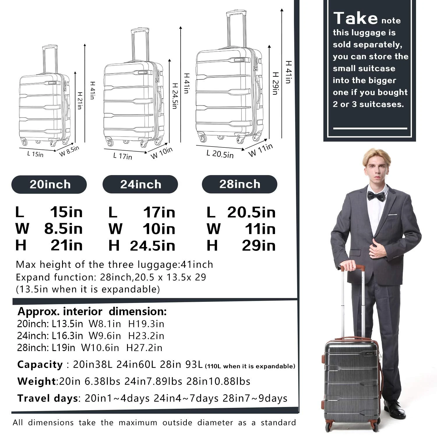 - Three different size: Size: 20inch (21 x 8.5 x 15), 24innch (17 x 10 x 24.5) 28inch (20.5 x 11x 29), Please note that ONLY 28in is Expandable, adding 15%to the scalable space.