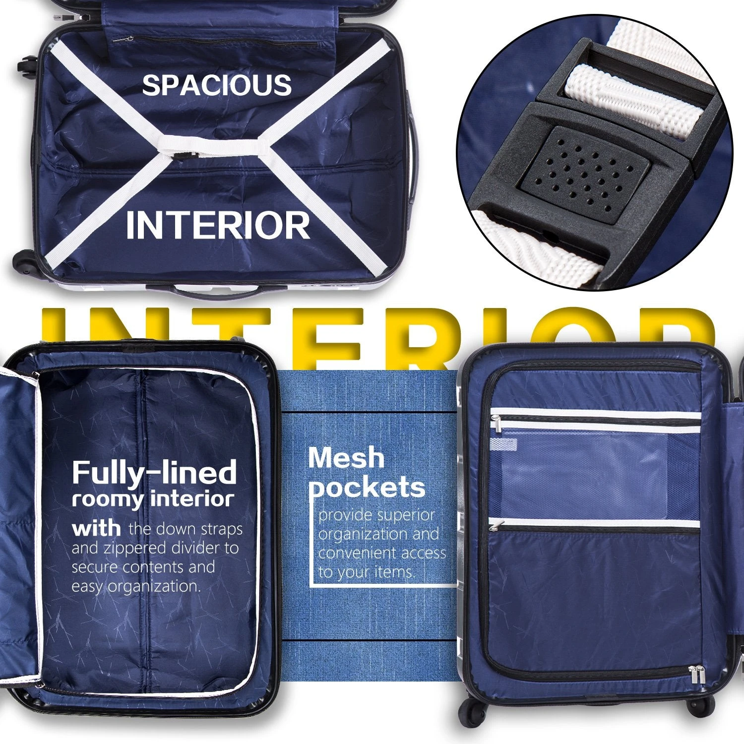 Details: Designed to provide travelers comfort, functionality, reliability, and peace of mind, our 20inch suitcase is suitable for carrying onto airplanes. Perfect for business and leisure travelers, fashionable traveler and for those who love travelling. The suitcase benefits hugely from its ABS+PC hard plastic shell. It highly suited to the rigorous of modern transportation and rough treatment from baggage handlers. We’re dedicated to helping millions of travelers worldwide enjoy more of their happy traveling experience. Features of the luggage . 28inch is expandable for up to 15% additional packing capacity; 20inch is perfect carry-on, 24inch is ideal for personal or business trip. Handle: 3-step pure aluminum telescoping handle for comfortable maneuvering. Wheels: four spinner wheels allow the suitcase to move seamlessly through 360 degrees of motion. Interior: The interior is fully lined with multi-use organizational pockets make it easy for packing clothes. Measures Size: 20inch (21 x 8.5 x 15), 24innch (17 x 10 x 24.5) 28inch (20.5 x 11x 29)(13.5in when it is expandable) Capacity: 20in38L , 24in60L, 28in 93L(110L when it is expandable) Weight: 20in 7.5lbs 24in10.2lbs 28in11lbs Travel days: 20in1~4days 24in4~7days 28in 7~9days
