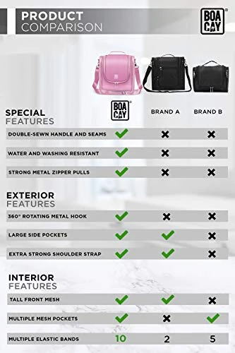 - A Perfect Gift for You or your Friends! If you are looking for an amazing gift idea that has that “extra-cool and innovative” Wow factor, then you will love the Boacay Travel Toiletry Bag. The Baby Pink Sleek design & colors are Suitable for any men or women, while the multifunctionality makes it an Essential accessory for an avid traveler. – Kindness is the Language!