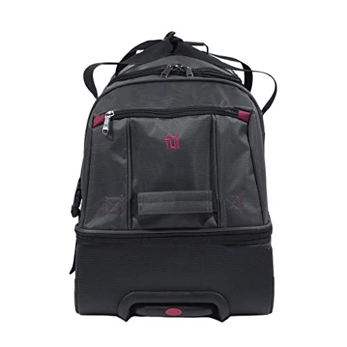 Details: The Tour Manager rolling duffle bag combines the ample storage space of your standard duffle bag with the ease of transport of your standard rolling luggage suitcase. It offers a spacious, split level storage compartment that can ether divide in half, with a zipper pass through, or function as a large single storage space. This rolling duffel easily rolls through airports on corner mounted wheels, and the telescoping grip handle makes transport a snap. The duffel bag also features additional storage in front and rear zipper compartments, A water resistant bottom ensures that your items will stay moisture free during travel.Features: Made from 1680 Denier ballistic nylon that is lightweight but durable and offers resistance to punctures, tears, and abrasions Unlike other duffels, it is mobile on corner-mount wheels for smooth and easy wheeling through airports A retractable pull handle is durable, easy to grip, and makes transport a breeze Split-level storage lets you organize your essentials with ease, or you can have one large storage compartment with the pass-through zipper panel The upper half of the bag has high storage volume and a large top opening, making the duffel ideal for longer trips. Front and rear zipper compartments and a Logo panel zipper compartment lets you have quick convenient access to smaller items Water resistant bottom ensures that your items will not get wet during transport Front and rear grab handles make for quick and easy loading into overhead storage bins or trunks