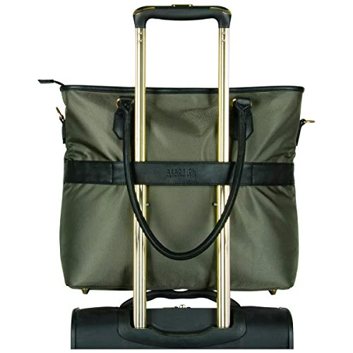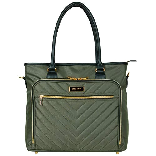 Details: A must-have tote, fashionable enough for everyday use. The stylish, polyester twill exterior with chevron quilted detail and a tear-resistant, fully-lined interior and sturdy construction with a large single compartment and eye-catching, distinctive gold hardware make this bag great for business and travel alike. The laptop pocket is padded to fit most laptops with up to a 15-inch screen, and a separate padded tablet pocket fits most tablets. The front exterior has an easy-access zipper pocket for frequently needed items. A zip around front organization compartment with an open Slip Pocket and zippered pockets holds all of your business essentials. The main compartment includes a padded tablet pocket, laptop pocket, and zipper pocket, while still leaving plenty of room to store other needed belongings. The rear exterior features a trolley strap to fit over most luggage trolley handles for hands-free carrying, and tote style handles made to be worn over the shoulder allow an 8.5-Inch handle drop. Another carrying option is the removable, adjustable, padded shoulder strap that extends to be 52 inches long. Perfect tote for work, school, college, as a gift, for valentine’s day or Mother’s Day, or to hold all your needed belongings on your commute to work. A straightforward and stylish tote, great for business, travel, or everyday use. ★ Overall Dimensions: 17” L x 13” H x 5” D. ★ Laptop pocket Dimensions: 15” L x 10.5” H x 1.0” D. ★ Weight: 2.15 lbs. ★