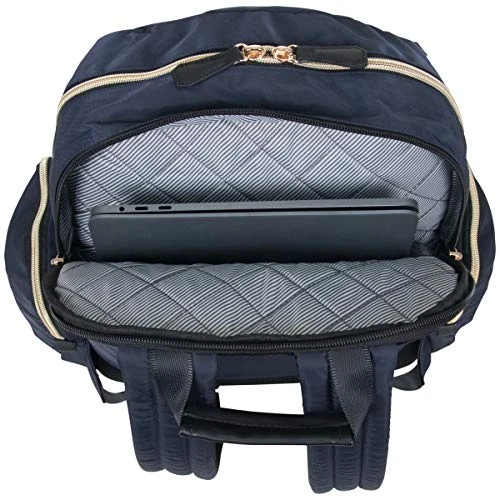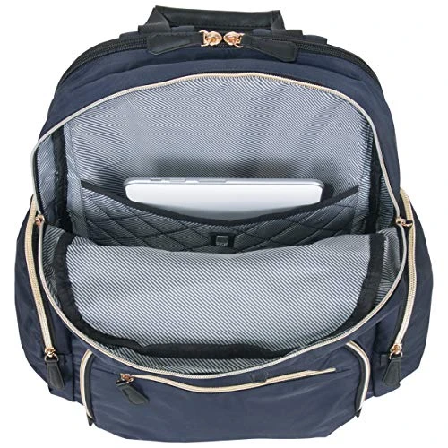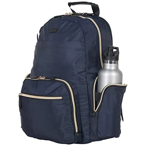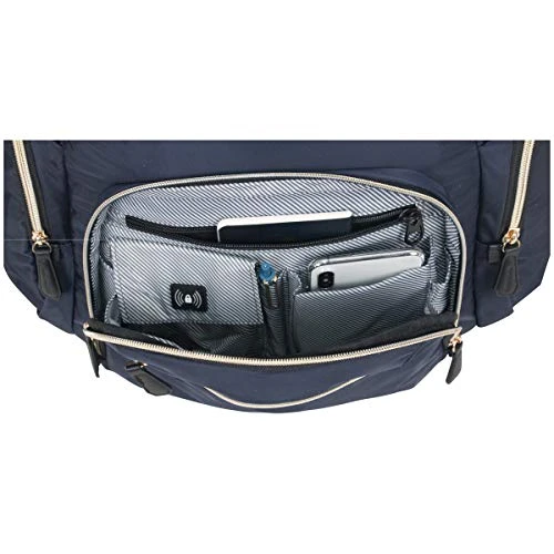 Details: Radio frequency identification (RFID) Blocking technology in organizer pockets Lined with thin shielding fabric to help block Radio Waves From Being Transmitted From yours. Passports and Certain Credit/Debit Cards padded computer pocket fits most 15″ Laptops padded tablet pocket accommodates most tablets stylish, sleek nylon exterior with gold zips and a tear-resistant, fully lined interior Front exterior features a hidden zippered stash pocket to store and protect valuables and an RFID protected zip down organizer pocket to store a variety of business essentials dual side exterior zip around pockets to hold water bottles or accessories front compartment includes a padded tablet pocket, two open Slip Pockets, with room to hold other needed belongings Rear compartment is fully padded to hold and protect your laptop easy to grab top handle Rear exterior features a mesh back panel, trolley tunnel to fit over most luggage upright trolley handles for hands free carrying, and adjustable, padded shoulder straps overall Dimensions: 16″ H x 13″ L x 6″ D Weight: 1.8 lbs. includes a lifetime limited manufactures warranty
