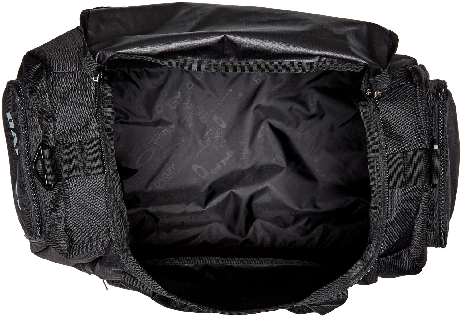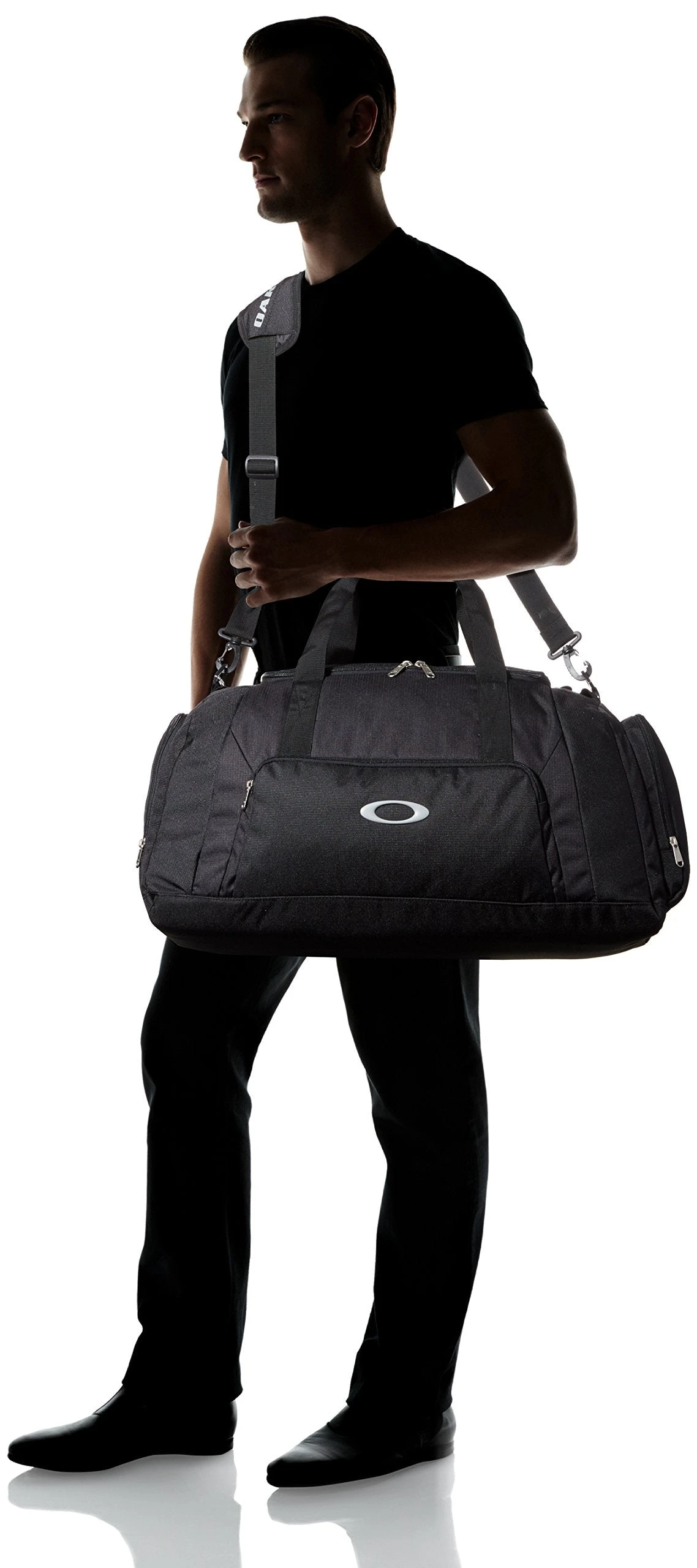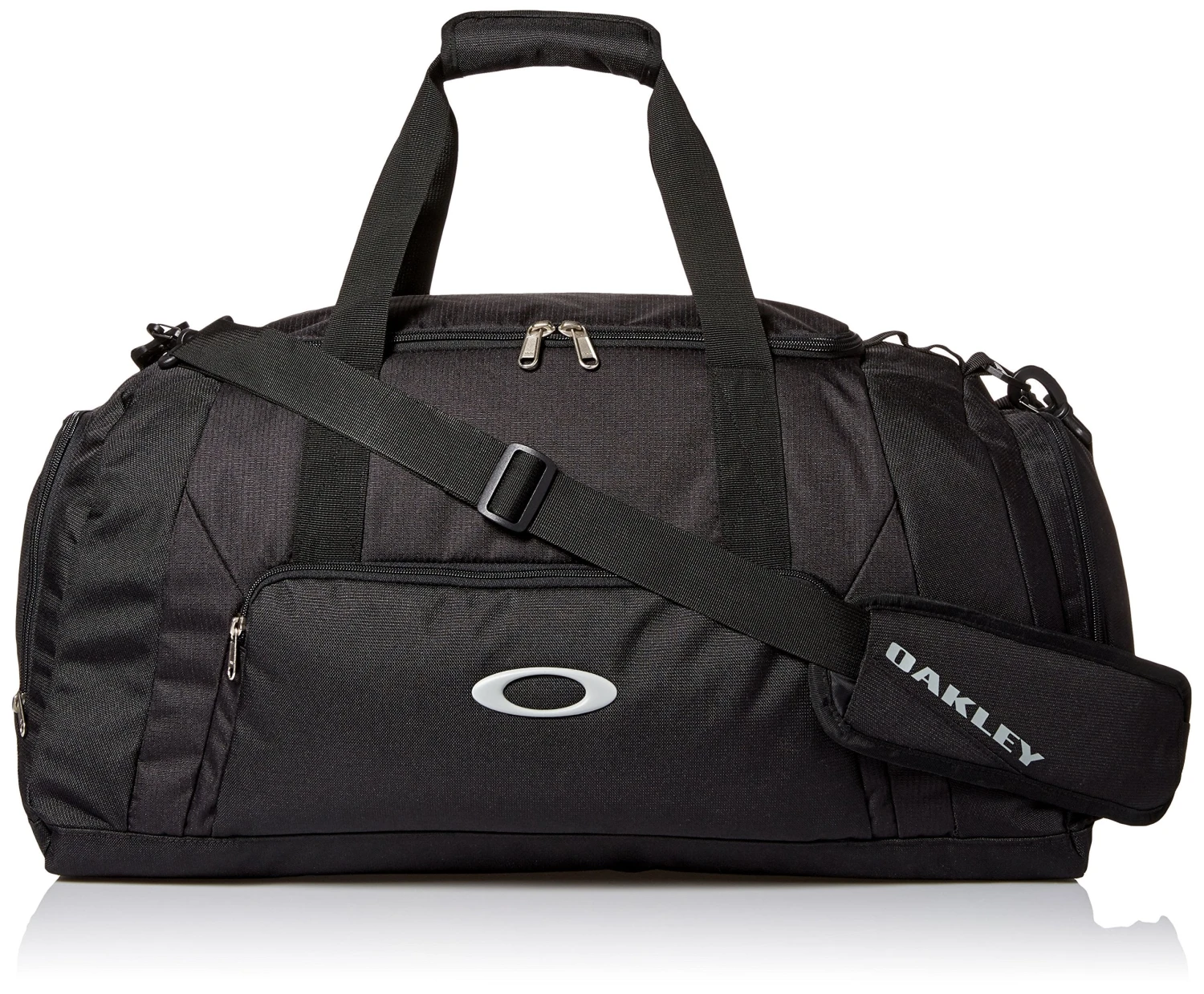 Details: Oakley duffle bag with front organizer pocket, side pocket with fleece-lined interior pocket, side pocket to hold shoes or dirty gym clothes, air mesh shoulder strap, 55L capacity.