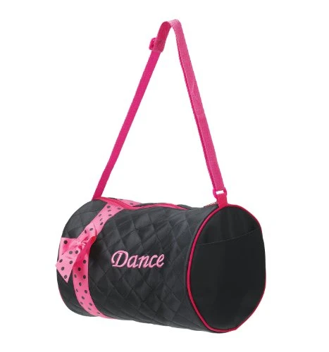 Details: Quilted pink duffel w/embroidered Dance and polka dot ribbon. Zipper closure and zipper money pocket inside. Dimensions:12″ Wide X 12″ High