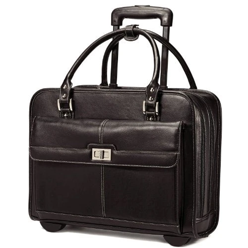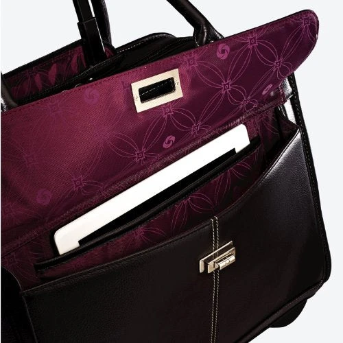 Details: Carry your laptop and other essentials for the daily commute or business travel inside this chic mobile office from Samsonite. The Samsonite Women’s Laptop Mobile Office is made from faux leather and features a sleek and stylish design with contrast accent stitching, two top handles for hand toting, a retractable pull handle, and smooth rolling wheels for easy mobility. This laptop case has a dual compartment design with a padded laptop pocket, a rear compartment to hold files and documents, and slip pockets to hold accessories. A separate front organizer compartment includes a pocket for your iPad or table, pen sleeves, and slip pockets to hold small personal items.