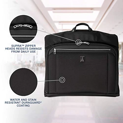 Details: You’ve got style. This bag keeps it protected. The platinum elite bi-fold carry-on garment valet from Travelpro delivers luxury in a lightweight carry-on garment bag that accommodates a hanging suit or dress and protects from wrinkles. Built-in interior pockets provide additional capacity for packing shirts or folded clothes, accessories and more. Premium, durable fabric, Leather Trim and chrome touches add polish and pizzazz, while two exterior pockets are designed for convenient access to onboard essentials or increased packing capacity. This fit to fly carry-on bag has been sizer been tested to accommodate overhead bin space on most major US airlines.