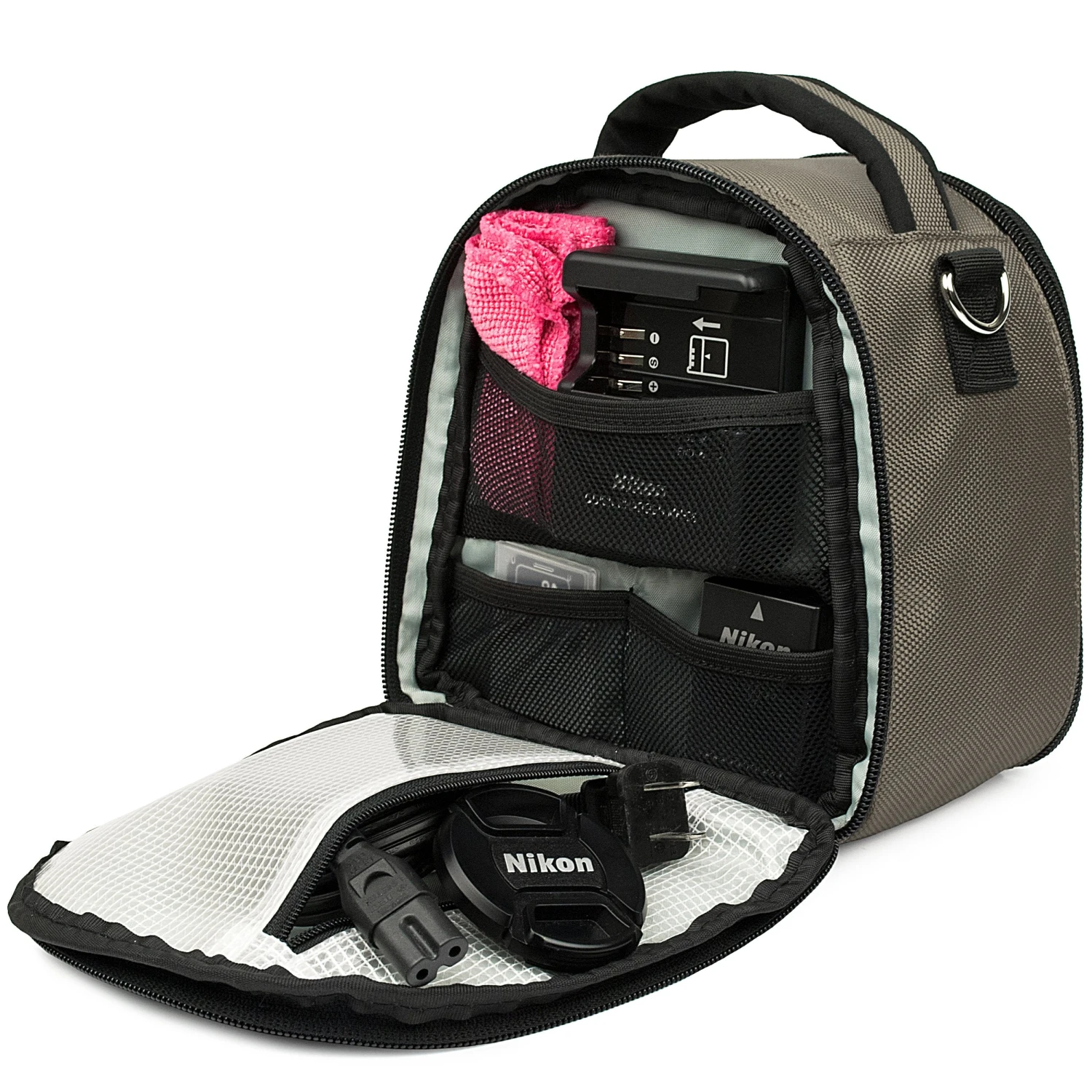 - Rear zippered compartment allows you to store cables, memory cards, and batteries
